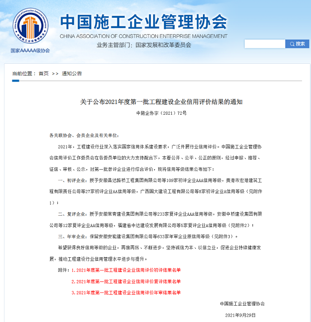 近日,在中國施工企業(yè)管理協(xié)會(huì)召開的2021年度工程建設(shè)誠信企業(yè)推介大會(huì)上,公司再次獲得 “2021年度工程建設(shè)AAA信用等級(jí)企業(yè)”和“2021年工程信用7星級(jí)企業(yè)”等共二項(xiàng)榮譽(yù),這也是“十四五”開局之年公司全面貫徹新發(fā)展理念、構(gòu)建信用新發(fā)展格局在行業(yè)信用體系建設(shè)方面取得的突出成效。2021年,公司不斷完善信用體系,強(qiáng)化信用導(dǎo)向,企業(yè)管理水平和社會(huì)信譽(yù)度不斷提升。今后公司將以此為契機(jī),不斷總結(jié)經(jīng)驗(yàn),補(bǔ)齊發(fā)展短板,助力企業(yè)高質(zhì)量發(fā)展。