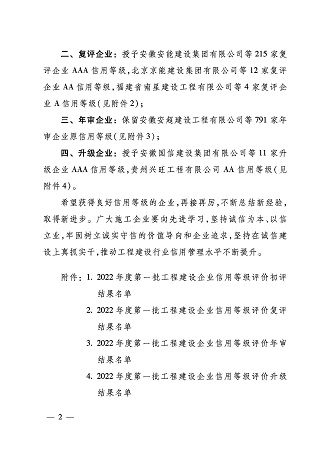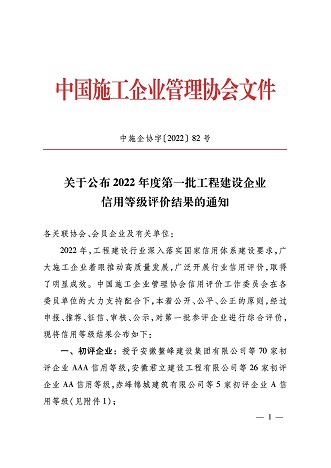 2022年,黃山市建工集團(tuán)股份有限公司再次榮獲施工企業(yè)最高信用評(píng)級(jí)“AAA級(jí)企業(yè)信用證書”。這是對(duì)黃山市建工集團(tuán)股份有限公司持續(xù)積累的經(jīng)營管理能力、合同履約能力、市場競爭能力及優(yōu)質(zhì)社會(huì)形象的權(quán)威認(rèn)證。