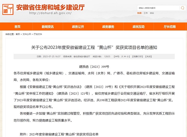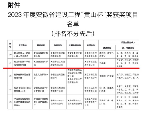 7月25日,省住建廳公布2023年度安徽省建設(shè)工程“黃山杯”獎獲獎項目名單,黃山建工承建的黃山職業(yè)技術(shù)學(xué)院風(fēng)雨操場項目工程位列榜單、喜獲殊榮。
