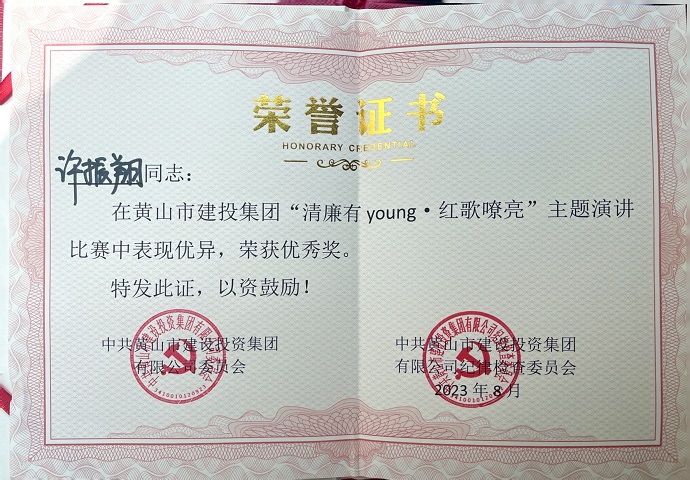 為慶祝中國共產(chǎn)黨成立102周年,深入推動學(xué)習(xí)貫徹習(xí)近平新時代中國特色社會主義思想主題教育,全面貫徹落實黨的二十大精神,8月18日,由黃山建投集團舉辦的“清廉有young·紅歌嘹亮”主題思政課隆重舉行,參賽選手以生動的語言、動聽的歌聲、真摯的感情為大家?guī)硪粓鰟e開生面的視聽盛宴,黃山建工集團青年員工許振翔在思政課演講比賽中取得優(yōu)勝獎。