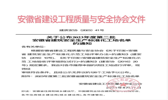 8月17日,安徽省建設工程質(zhì)量與安全協(xié)會發(fā)布2023年度第二批安徽省建筑安全生產(chǎn)標準化工地名單,黃山建工集團仙人洞南路東側(cè)D1地塊(文瀾軒)項目獲評“安徽省建筑安全生產(chǎn)標準化工地”。