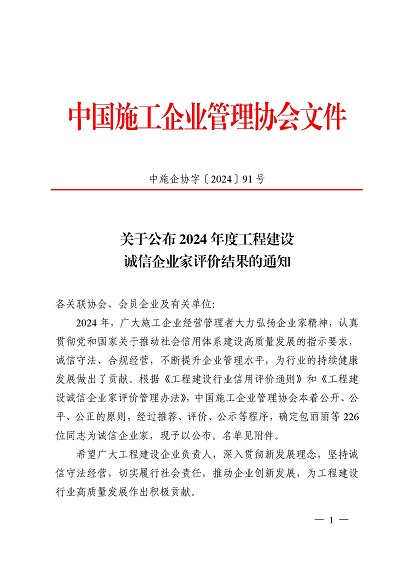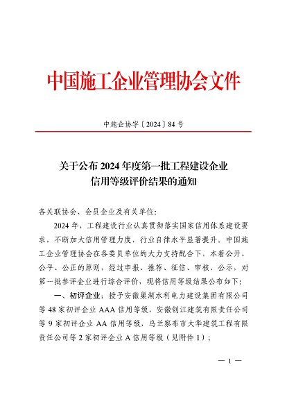 近日,中國(guó)施工企業(yè)管理協(xié)會(huì)公布了2024年度第一批工程建設(shè)企業(yè)信用等級(jí)評(píng)價(jià)結(jié)果的通知、工程建設(shè)誠(chéng)信企業(yè)家評(píng)價(jià)結(jié)果、工程建設(shè)誠(chéng)信項(xiàng)目經(jīng)理名單。黃山建工集團(tuán)順利通過(guò)AAA級(jí)信用企業(yè)的年審,繼續(xù)保持AAA信用等級(jí)的殊榮。黃山建工集團(tuán)總經(jīng)理葉金發(fā)獲評(píng)誠(chéng)信企業(yè)家,項(xiàng)目經(jīng)理畢星豪獲評(píng)誠(chéng)信項(xiàng)目經(jīng)理。此次榮譽(yù)是對(duì)黃山建工集團(tuán)在工程建設(shè)領(lǐng)域的綜合實(shí)力和誠(chéng)信經(jīng)營(yíng)的高度認(rèn)可。