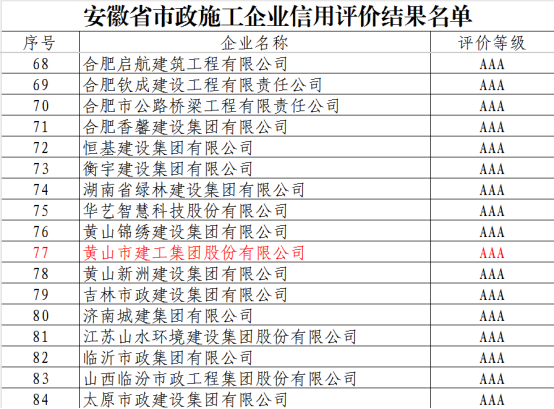 近日,安徽省市政工程協(xié)會正式發(fā)布《關(guān)于公布2025年安徽省市政施工企業(yè)信用評價結(jié)果的通知》。黃山市建工集團憑借卓越的綜合實力、規(guī)范的市場行為、優(yōu)良的工程品質(zhì)及堅實的信用體系建設(shè),成功獲評最高信用等級——AAA級。標(biāo)志著集團在誠信經(jīng)營、履約能力與社會責(zé)任履行方面獲得了行業(yè)主管部門與協(xié)會的高度認可,是企業(yè)信用建設(shè)領(lǐng)域的又一重要里程碑。
